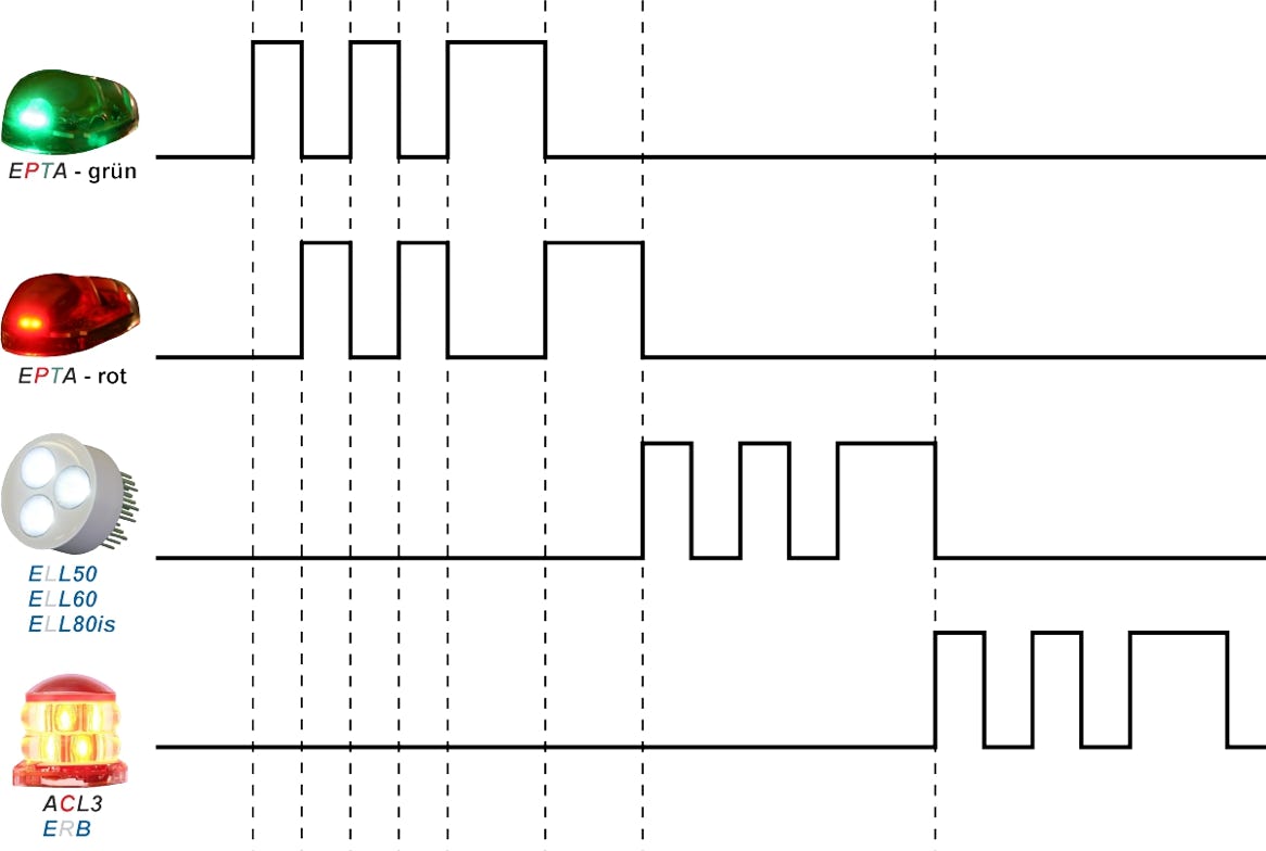 Das System "Intelligente Synchronisation" gleicht die Lichtimpulse so ab, dass keine Überschneidungen der einzelnen Lichtblitze entstehen. Wie in dem Diagramm zu sehen ist, werden durch die Synchronisation Batterie und Generator möglichst gering und gleichmäßig belastet, da immer nur eins der Lichter blitzt. Sich überlappende gefährliche Stromspitzen (Störungen) werden somit verhindert.
